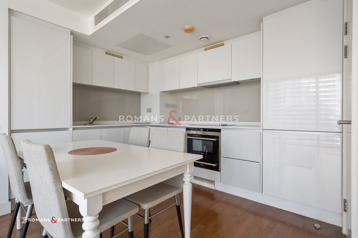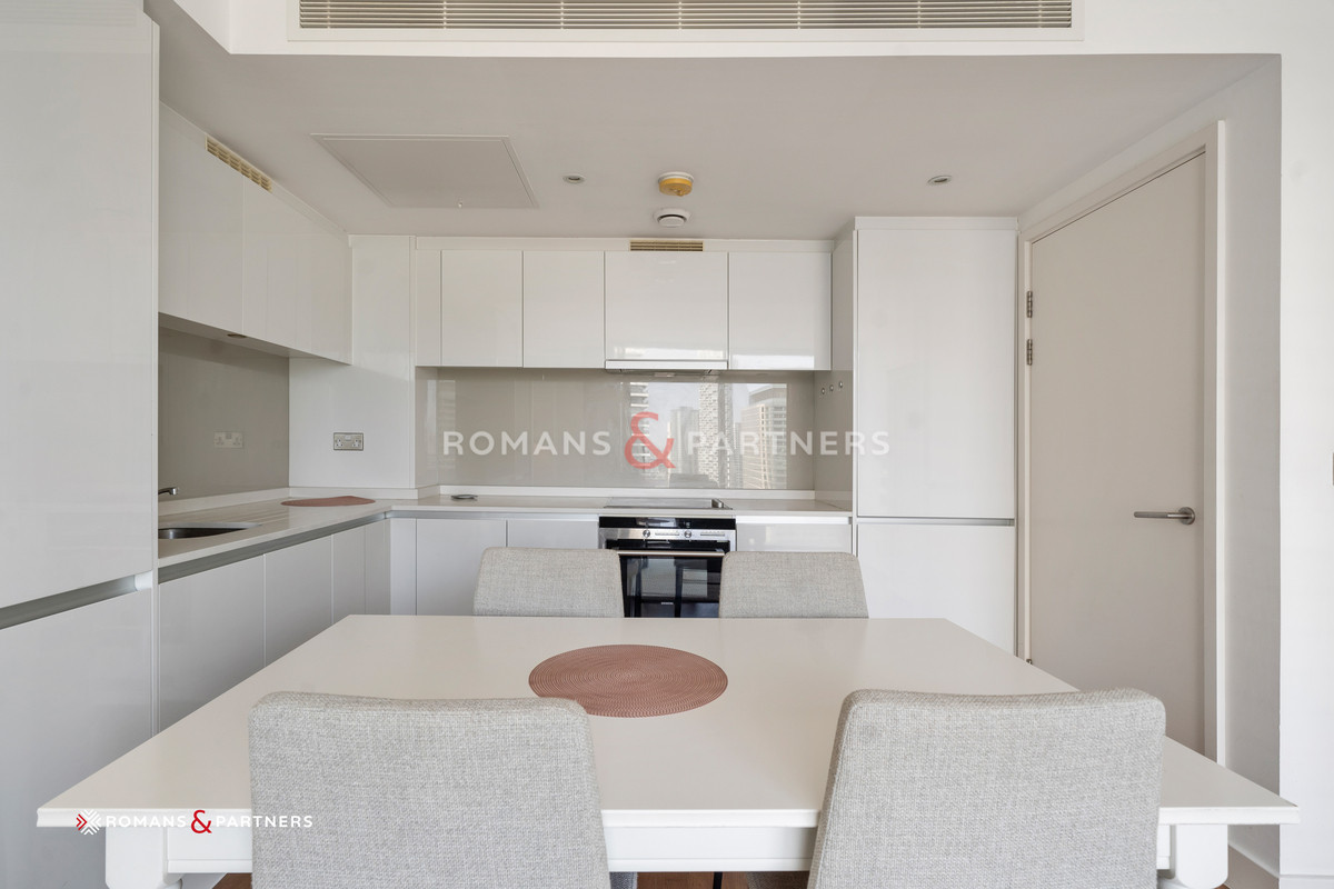 The property features a bright and spacious open-plan reception and dining area, accentuated by striking floor-to-ceiling windows that frame direct views over Canary Wharf, flooding the space with natural light and enhancing the modern ambiance.