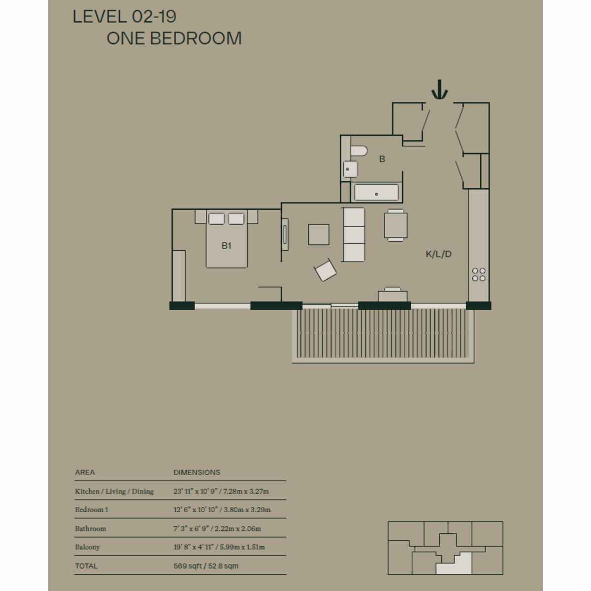 Spanning 569 sqft of thoughtfully designed internal space, the home is further complemented by a private balcony, perfect for enjoying fresh air and open vistas.